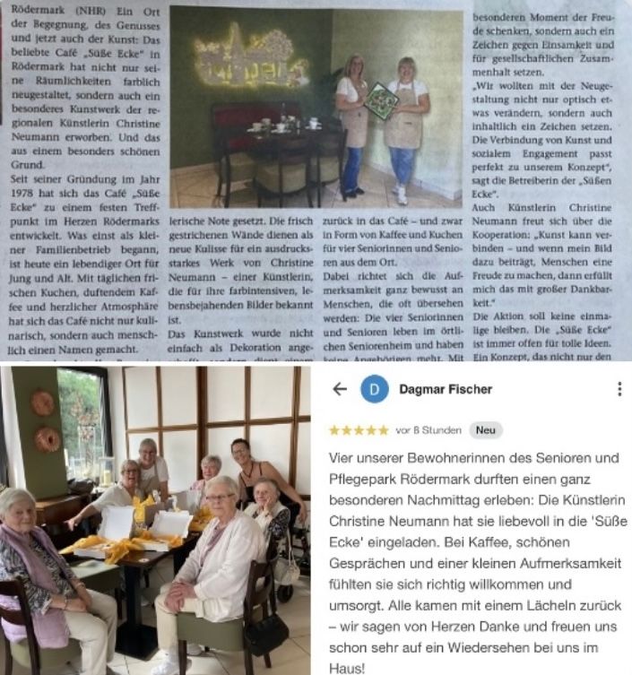 Im Cafe "Süße Ecke" in Rödermark durfte ich vier Bewohnerinnen des Senioren- und Pflegeparks Rödermark zu einem besonderen Nachmittag begrüßen. Bei Kaffee, Kuchen und schönen Gesprächen genossen wir gemeinsam die Kunst und das Miteinander. Als kleine Überraschung erhielt jede Teilnehmerin eine Kunst-Kreativbox, um selbst kreativ zu werden. Es war eine wundervoller Moment voller Freude, Begegnung und Inspiration- genau das, was Kunst für mich bedeutet.